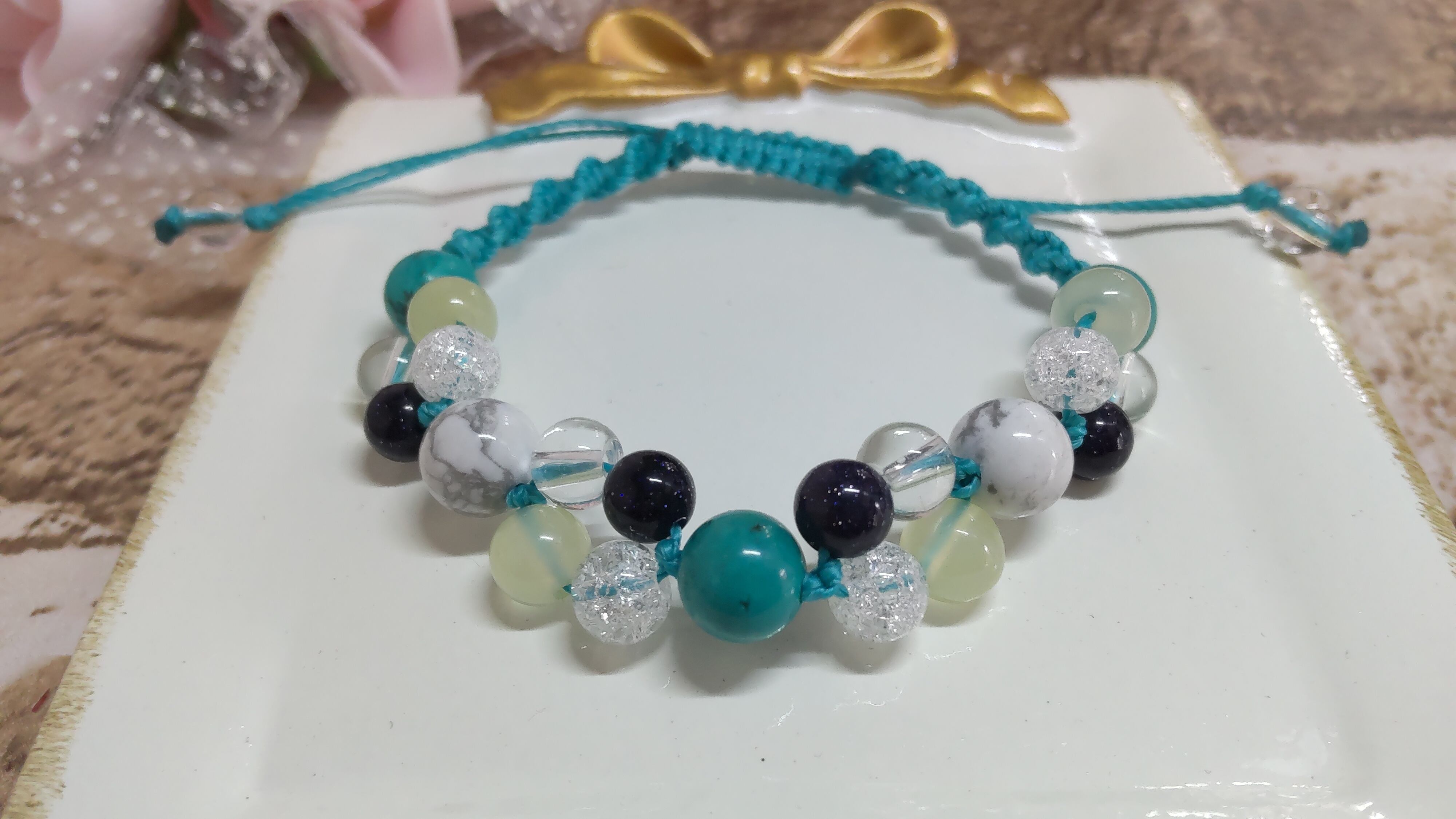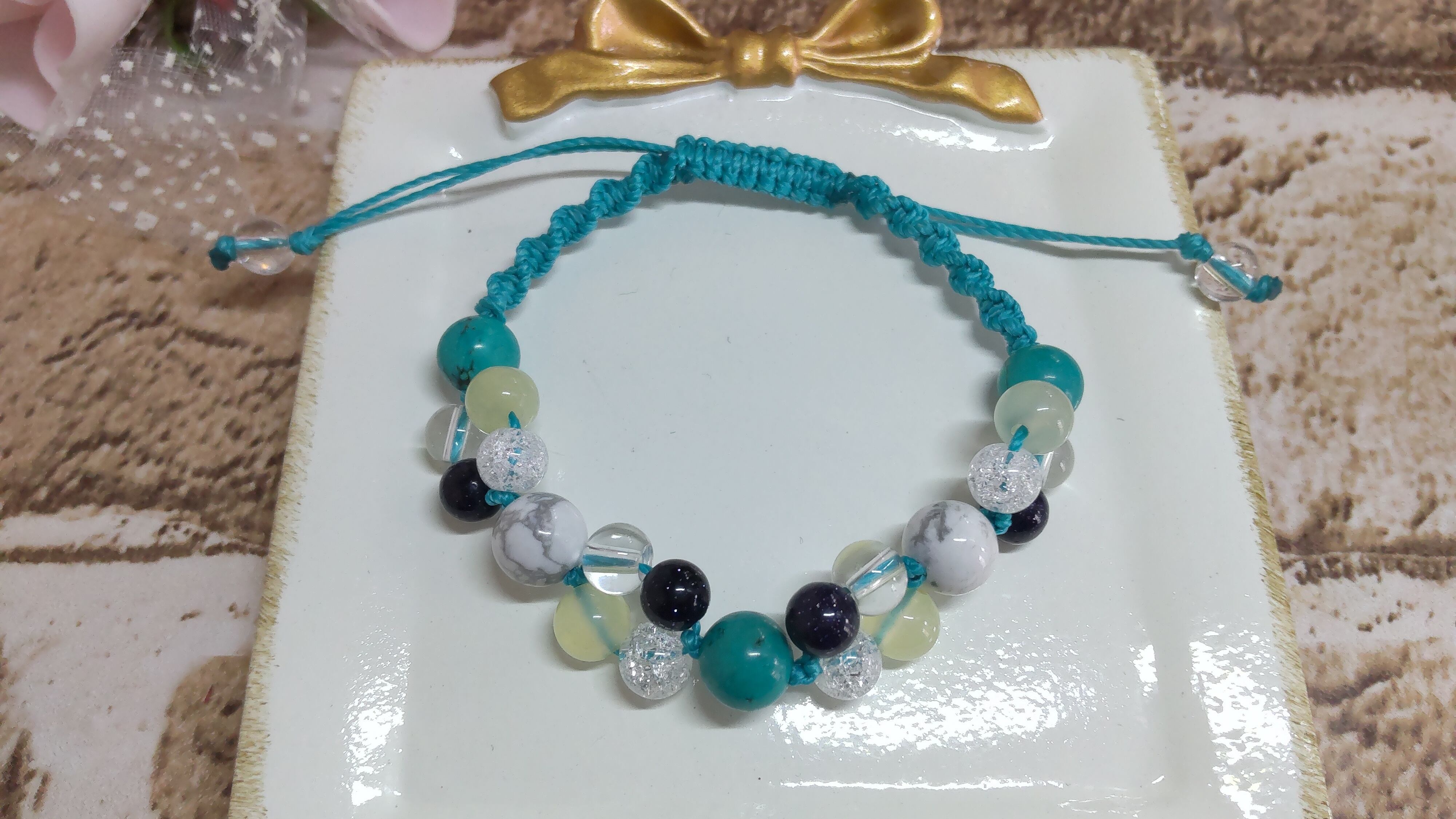 ターコイズ、ハウライト、ニュージェード、ブルーサンドストーン、、水晶を組み合わせた心が癒されるブレスレットができました。