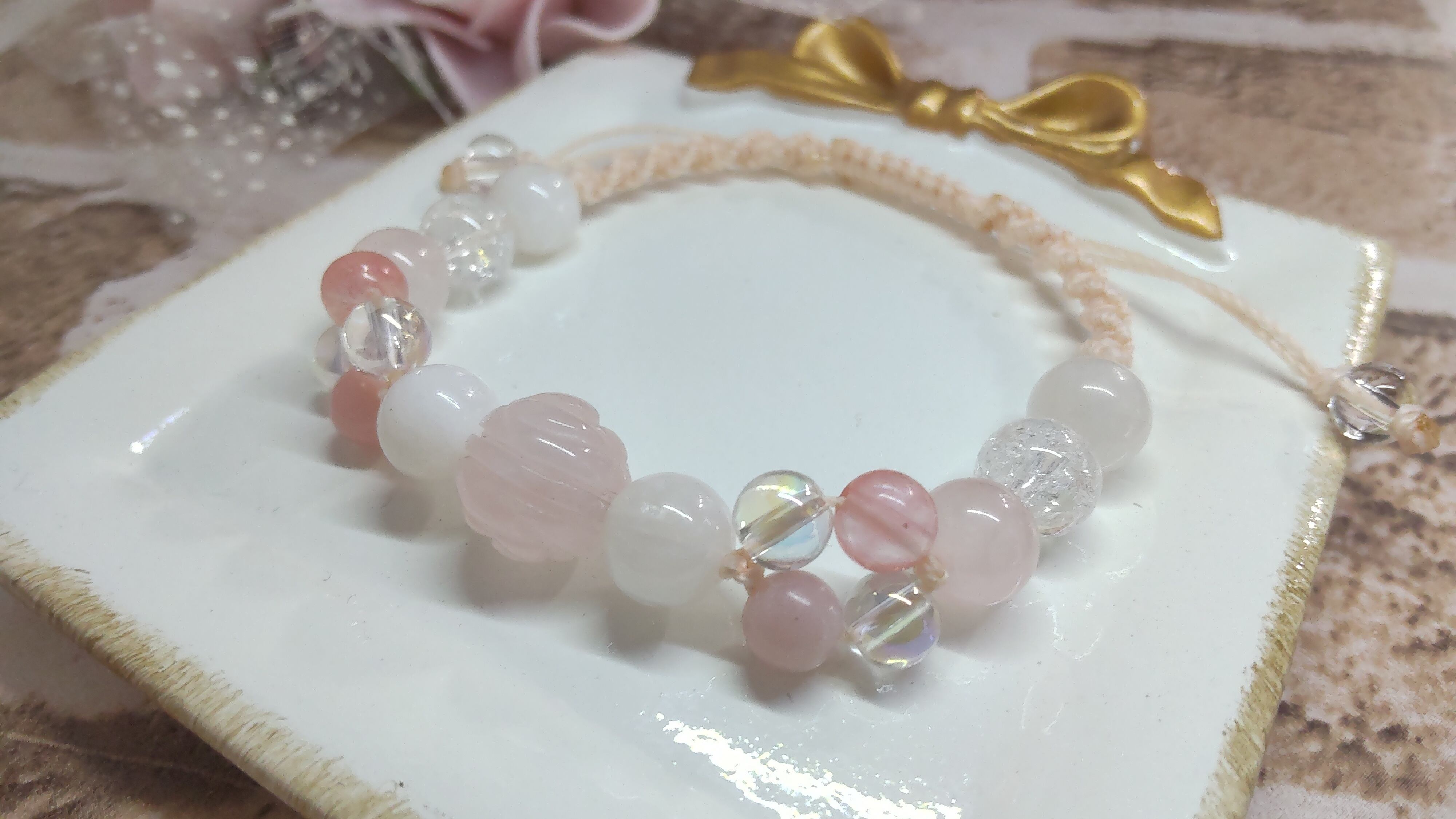 12mmサイズのバラの型のローズクォーツを中心に、ローズクォーツ、ムーンストーン、ピンクオパール、チェリークォーツ、レインボーオーラ、クラック水晶を組み合わせた心が癒されるブレスレットができました。